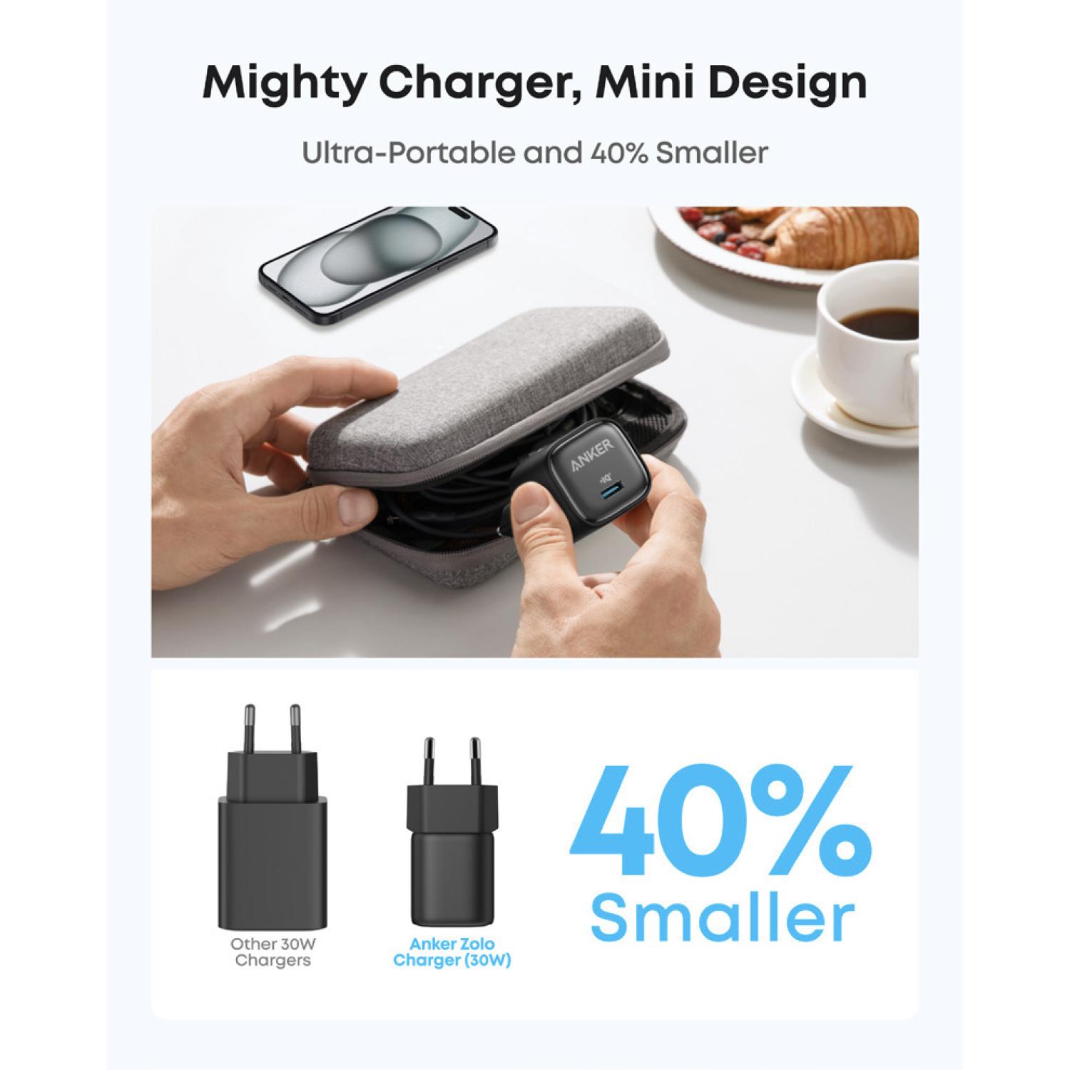 30W Anker Zolo Compact USB C PD Charger With Cable – 1 Port Black