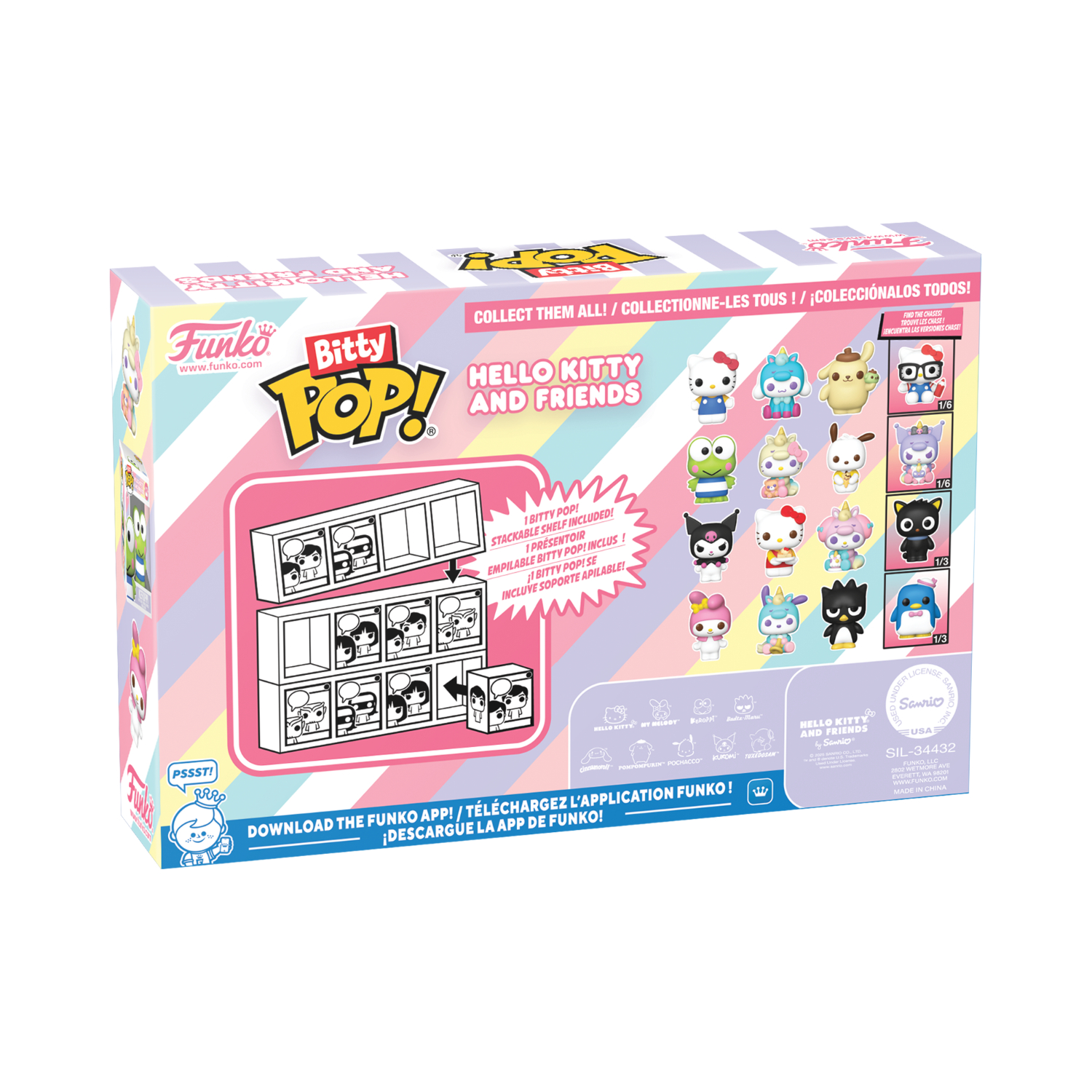 This Hello Kitty and Friends Funko Bitty Pop Series 1 4 Pack includes Bitty Pop! Hello Kitty (Classic), Cinnamoroll – Unicorn, Pompompurin, and one chase Bitty Pop collectible. Possible chase figures include Rare (1/3) Tuxedosam, Rare (1/3) Chococat, Hyper Rare (1/6) Kuromi – Unicorn, and Hyper Rare (1/6) Hello Kitty – Glasses. Chase figures are packed at random.
