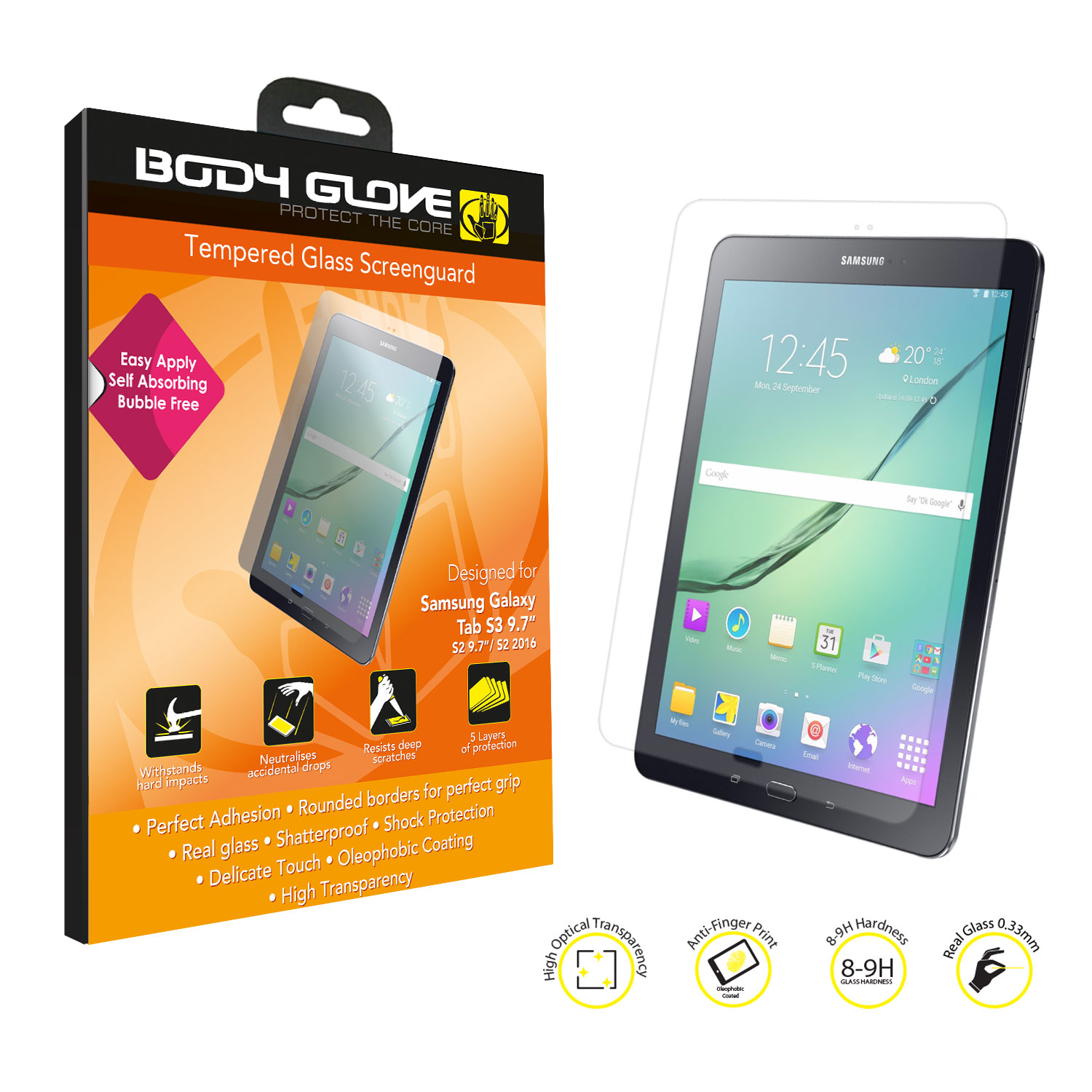 Give your Galaxy Tab S2 9. 7 inch screen the protection that is deserves. Body Glove screen guard for the Galaxy Tab S2 9. 7 inch is easy to apply and offer 5 layers of protection against accidental drops. Our screen guards are made with specially processed glass to protect the screen of the Galaxy Tab S2 9. 7 inch from shocks and scratches by absorbing the impact.