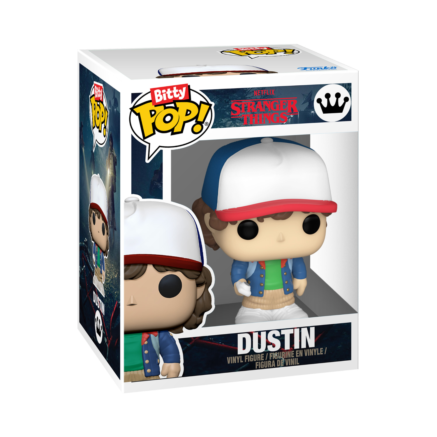 This Stranger Things Funko Bitty Pop Series 2 4 Pack includes Bitty Pop! Dustin, Lucas, Eleven (with Electrodes), and one mystery Bitty Pop! figure. Possible mystery figures include Hyper Rare Upside Down Barb (1/6), Hyper Rare Eleven Underwater (1/6), Rare Upside Down Will (1/3), and Rare Eleven with Eggos and Wig (1/3). Mystery figures are packed at random.